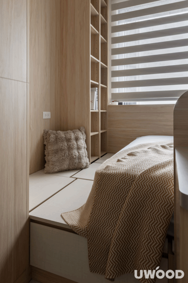 女兒房以自然樸潤的木質調鋪陳北歐氣息,在有限坪數中巧妙運用櫃體轉向、大尺度L型轉角書桌、隔板與架高臥榻床,創造一進又一進的空間層次,化解一進門就直視床鋪所帶來的壓迫感。.jpg)