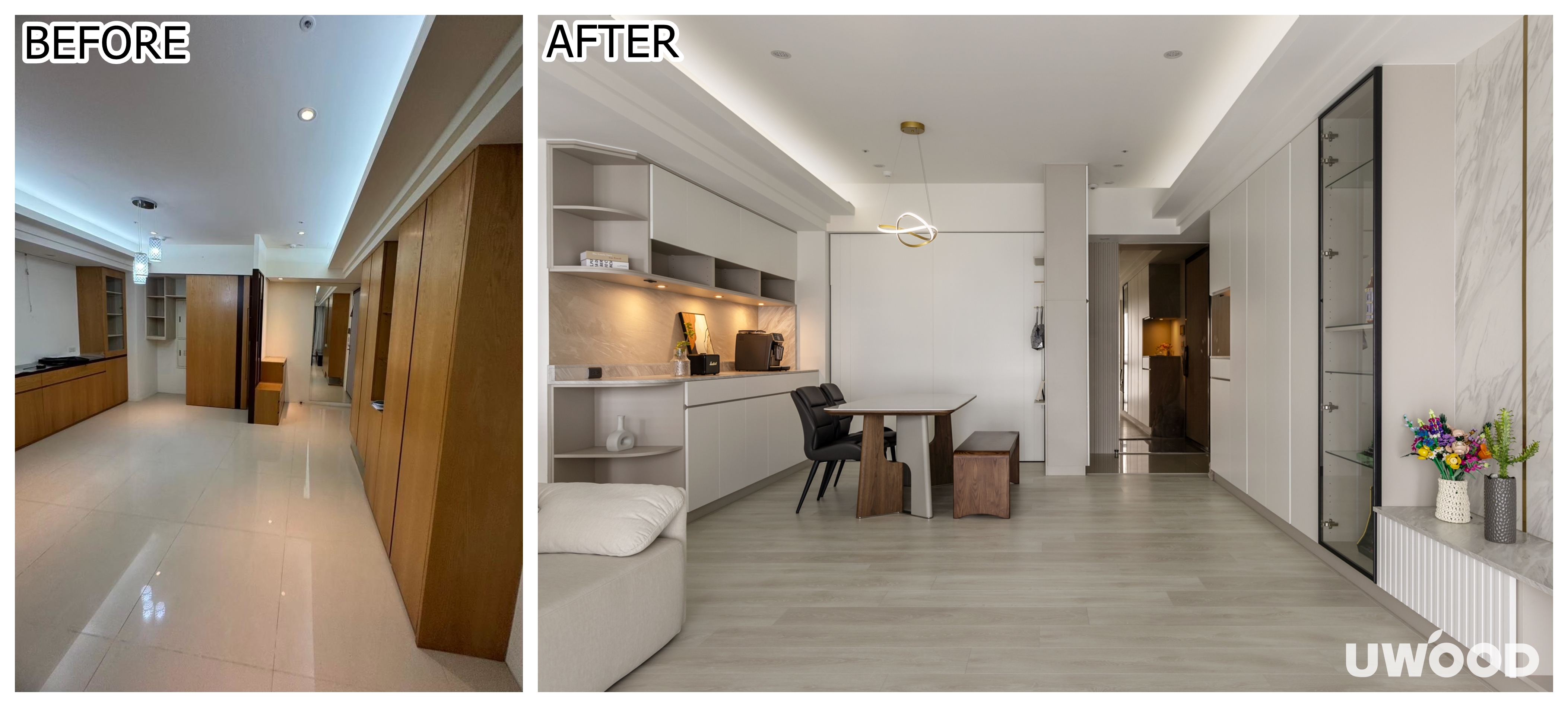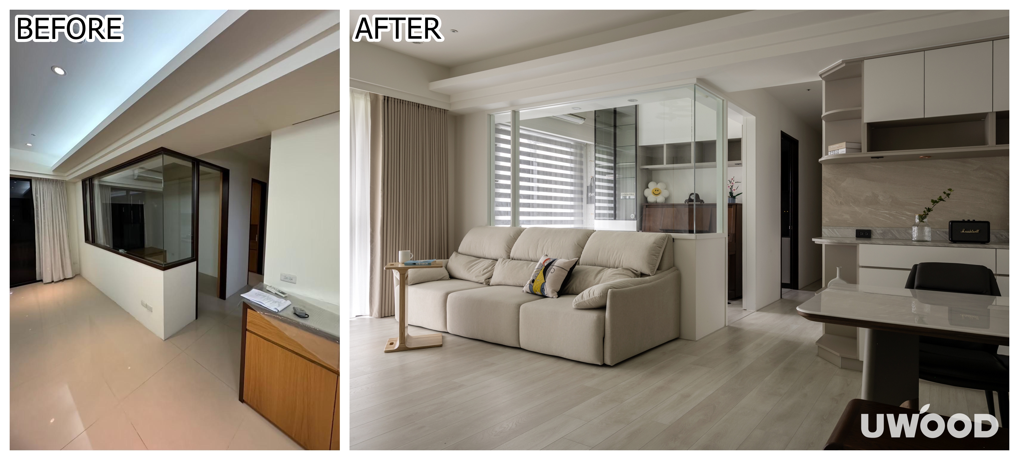 因女主人對視覺美感有著獨到品味,嚮往輕盈、簡約且富有質感的溫馨氛圍。原空間以深木色與厚重櫃體為主,風格略顯沉重,比例亦不夠協調。設計師以溫潤的奶茶色與木地板鋪敘空間底蘊,搭配造型主燈與間接照明,營造層次分明的光影氛圍,細緻梳理多元機能配置,同時低調展現屋主細膩、優雅的生活美學。
