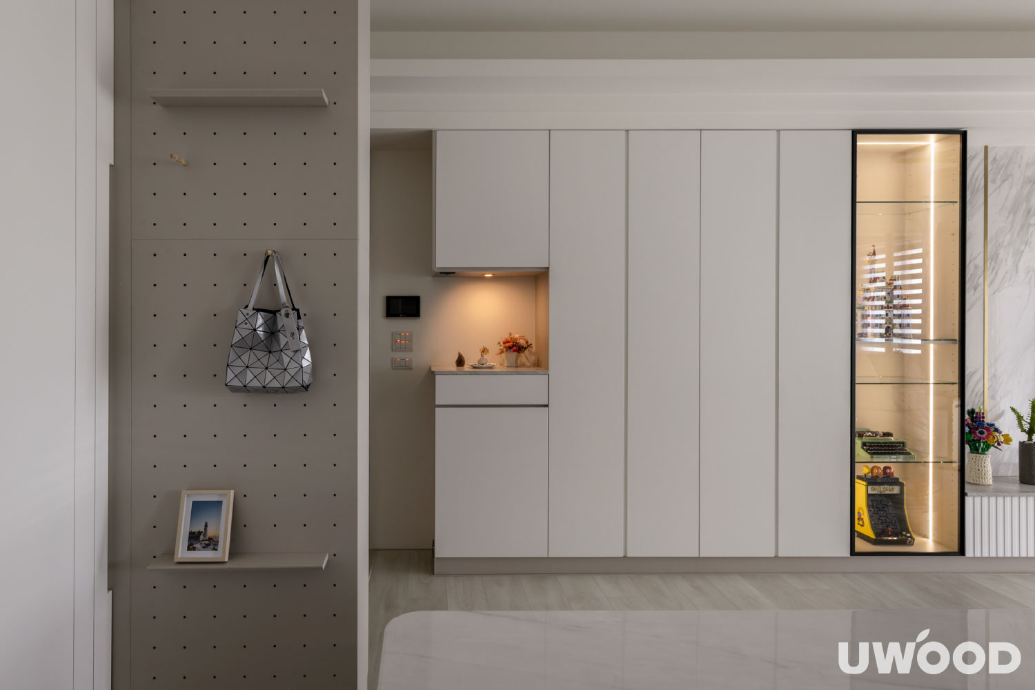 玄關櫃體背面亦貼心設置洞洞板,使收納更靈活有趣,也為日常挹注一份溫度與巧思。