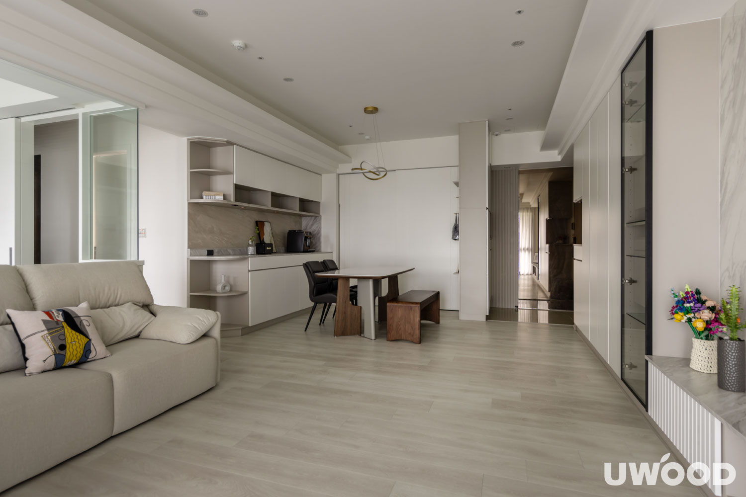 餐邊櫃由原先的 L 型形式,改為上下櫃配置,形塑出兼具擺放咖啡機與備餐機能的餐吧台;中段設置開放層架,方便展示精緻杯器,也為視覺增添層次。櫃體採用淡雅石紋系統板,與客廳主牆在材質語彙上相互呼應,營造整體一致的空間感。.jpg)