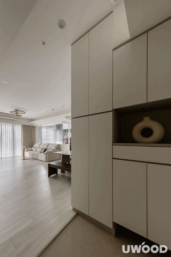 原本空間中的收納以零散櫃體拼湊而成,造成視覺上的碎裂感與參差不齊,區域之間的界線也不夠明確,從視覺到心理都帶來一絲混亂感。設計師細心梳理動線與收納需求,有條理地整合各項機能,透過邏輯清晰、秩序分明的系統櫃布局,不僅讓整體視覺更顯統一與舒適,也大幅提升收納效能,同時營造出溫潤且安定的生活氛圍。