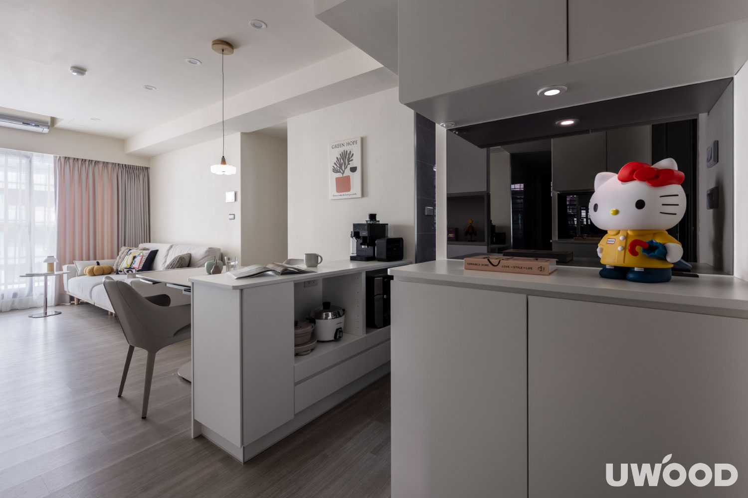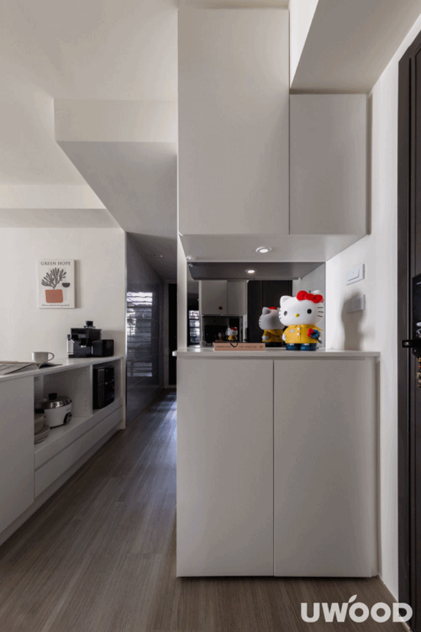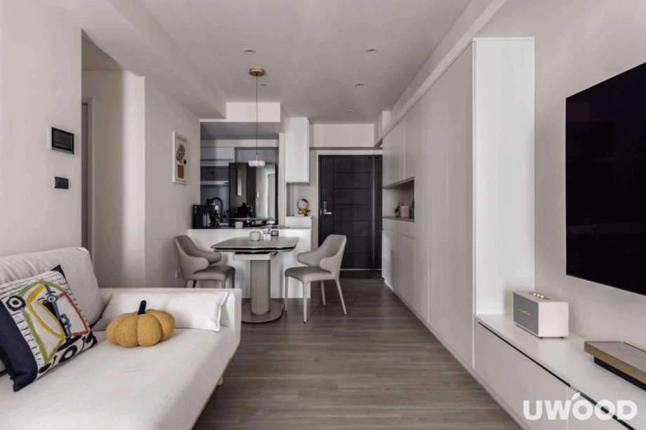 推門而入,大面積的奶茶色與淺灰色調靜靜鋪陳空間基調,柔和包覆著視線,也讓情緒在踏入家門的瞬間慢慢沉澱。為了回應屋主龐大的收納需求,設計師將大量儲物機能轉化為隱性立面設計。所有櫃體皆以無把手、無多餘分割的面板呈現,牆面彷彿一幅簡潔純淨的畫布,使收納悄然隱身其中,也在視覺上放大了21坪空間的尺度。.jpg)