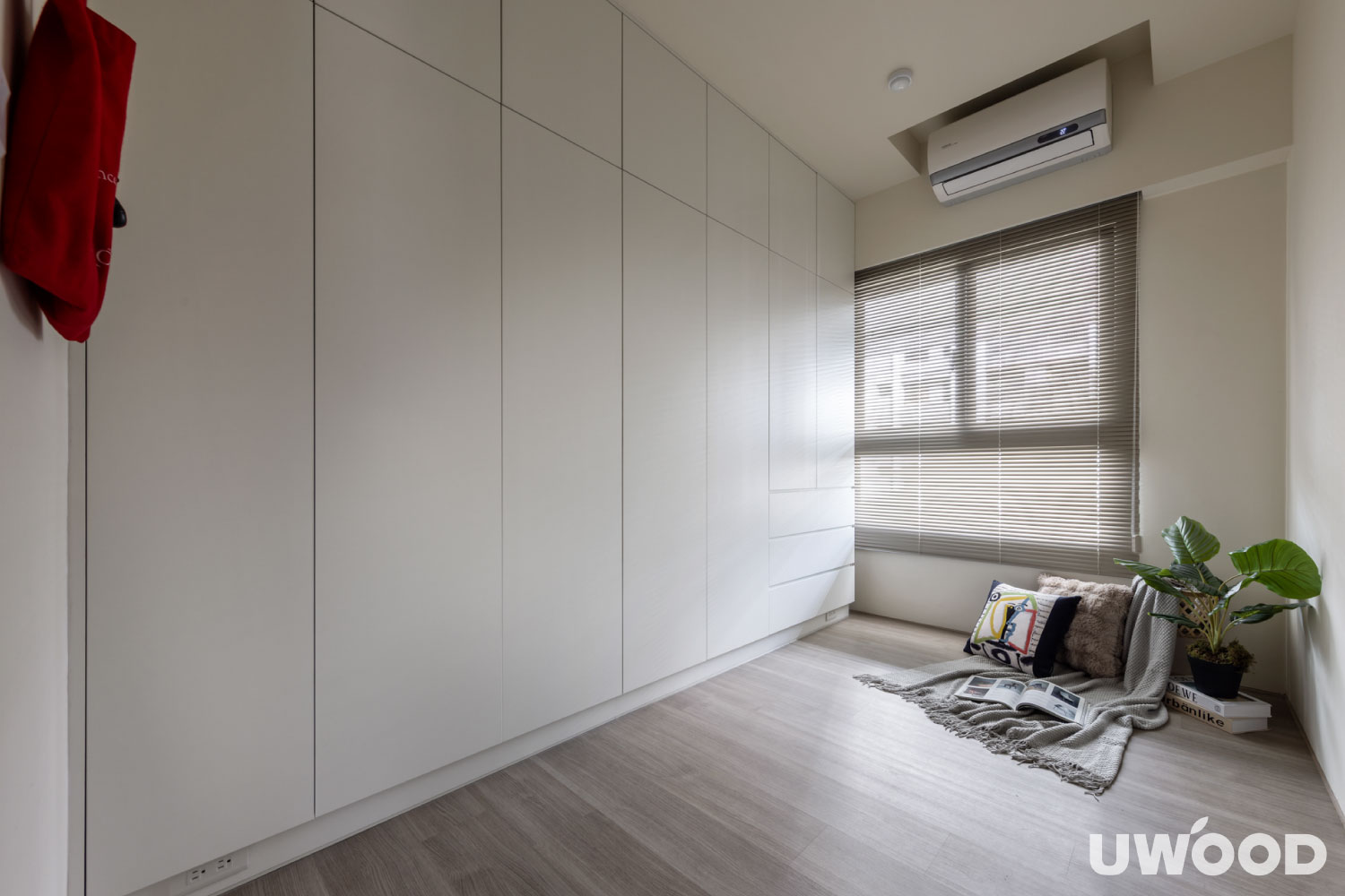 空間內僅規劃了一面頂天立地的大容量衣櫃,其餘地坪完整留白,讓這片純粹的空間成為屋主夫妻日常瑜珈伸展與靜心放鬆的角落。在這裡,空間不再只是收納衣物的地方,更是與自我對話的最佳靜謐之所。