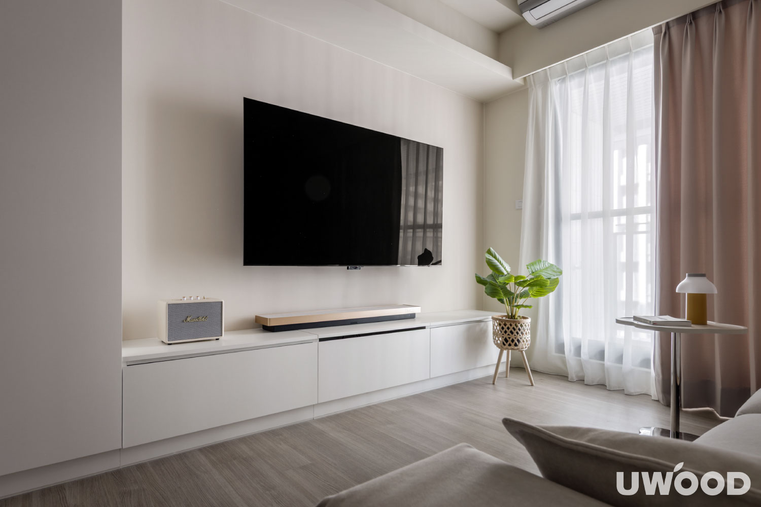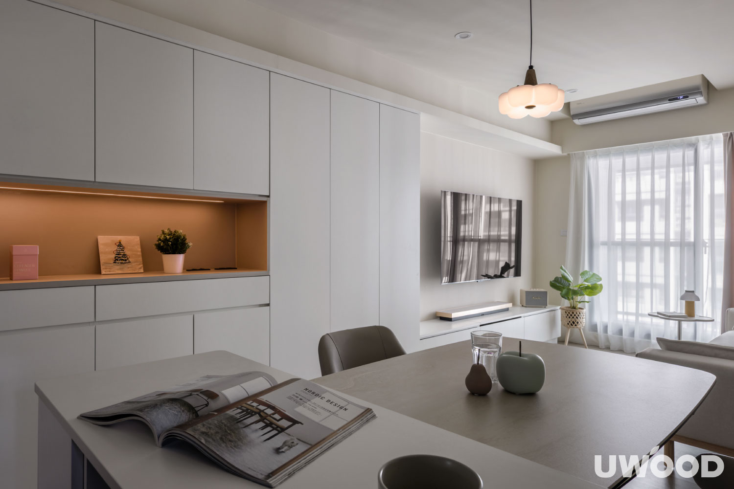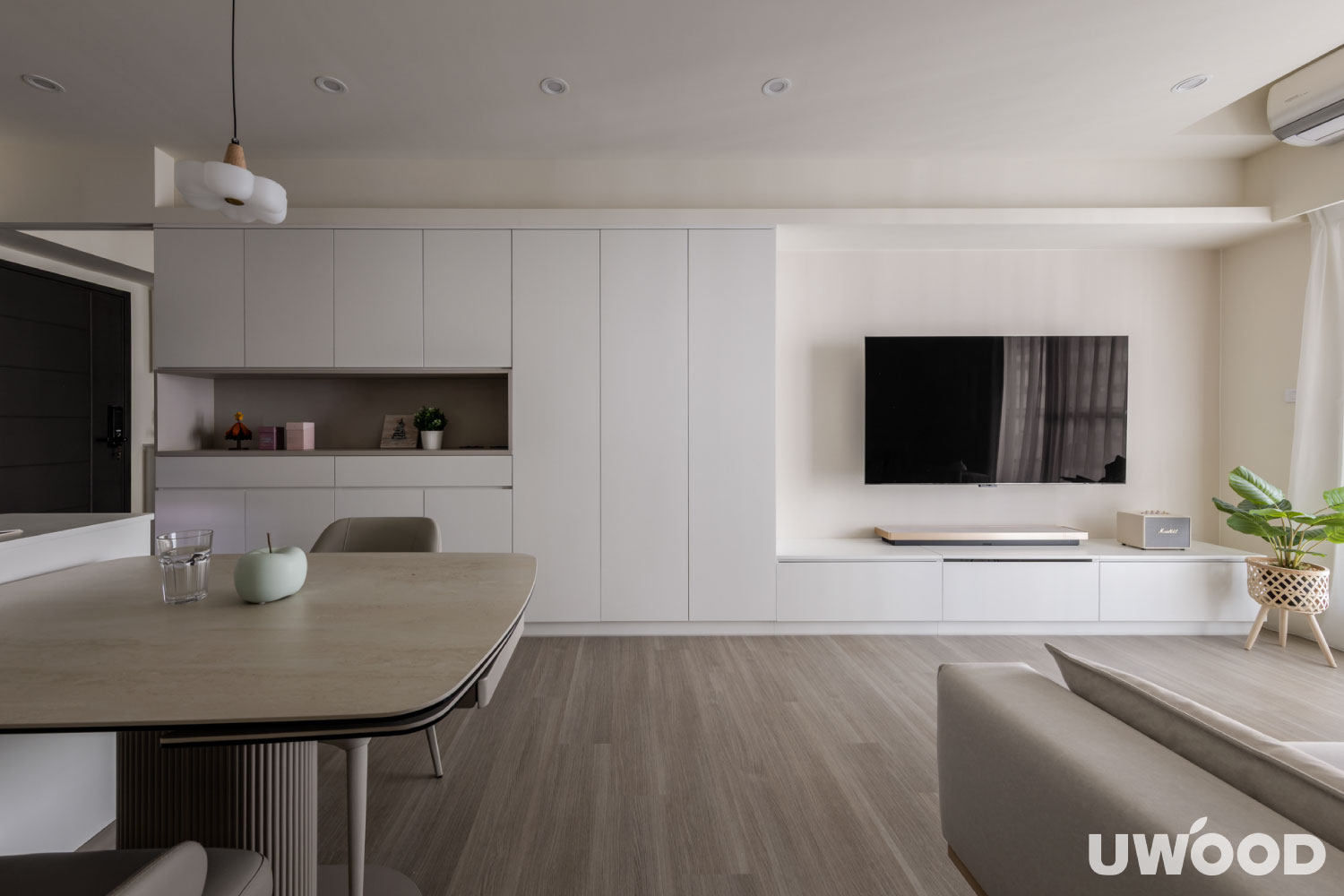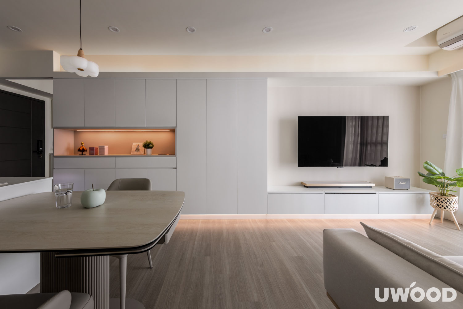電視主牆維持極簡純淨語彙,以溫潤奶茶色細膩鋪陳,不做過多裝飾,讓空間回歸柔和而安定的氣息。.jpg)