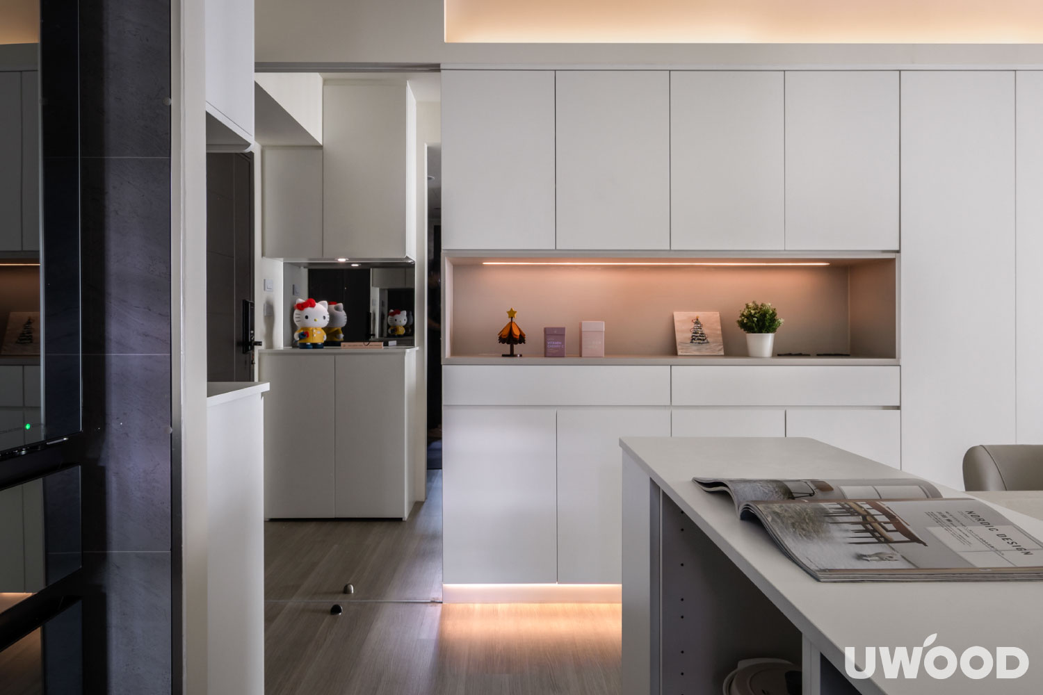 這個家的靈魂,在於光影的層層堆疊。為了營造女主人嚮往的簡約純淨氛圍,設計師以暖色LED線燈悄悄勾勒空間輪廓——從展示平台、櫃底踢腳,到天花板柔和光帶,細緻的光影一路延伸至客廳,讓視覺自然向前展開。