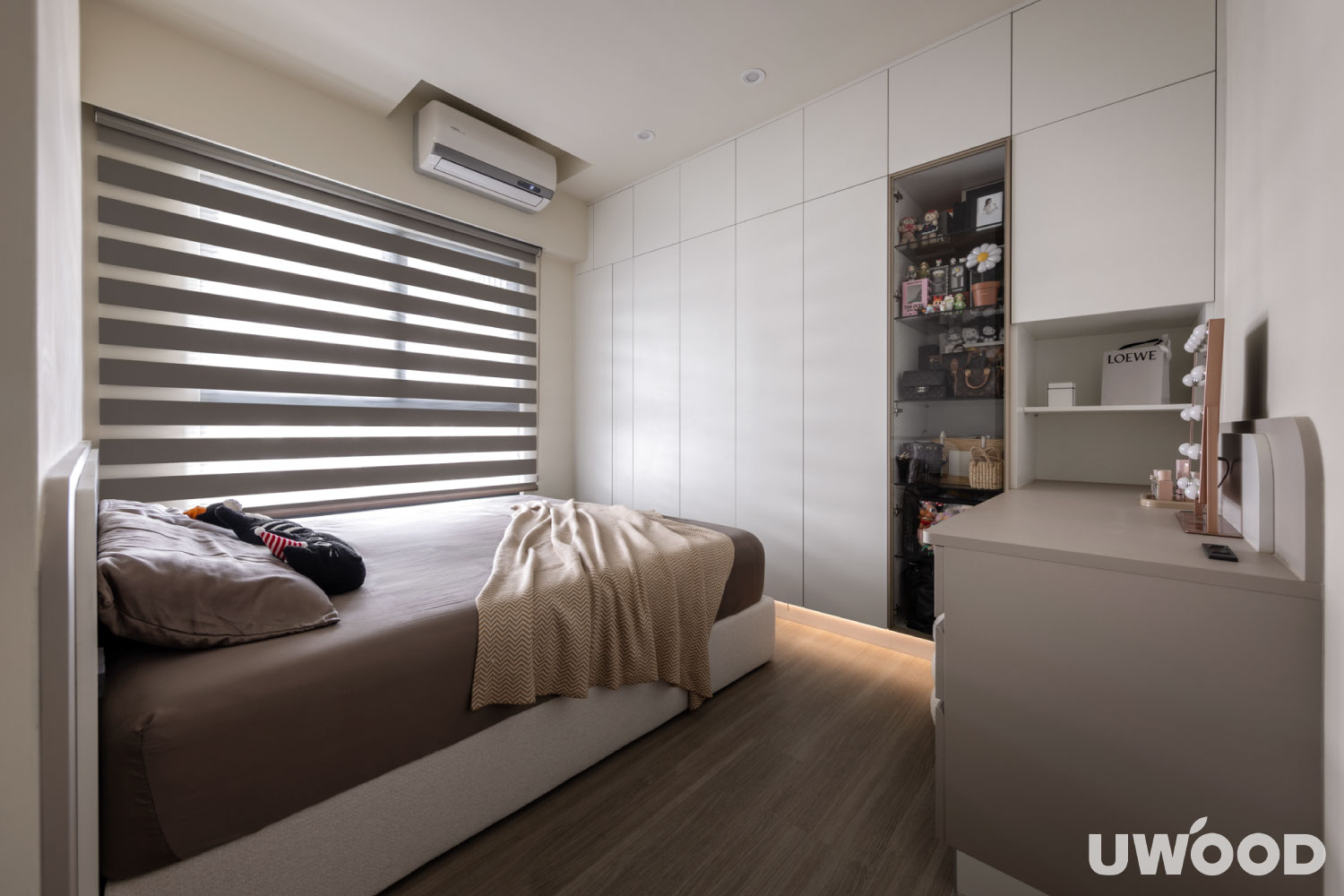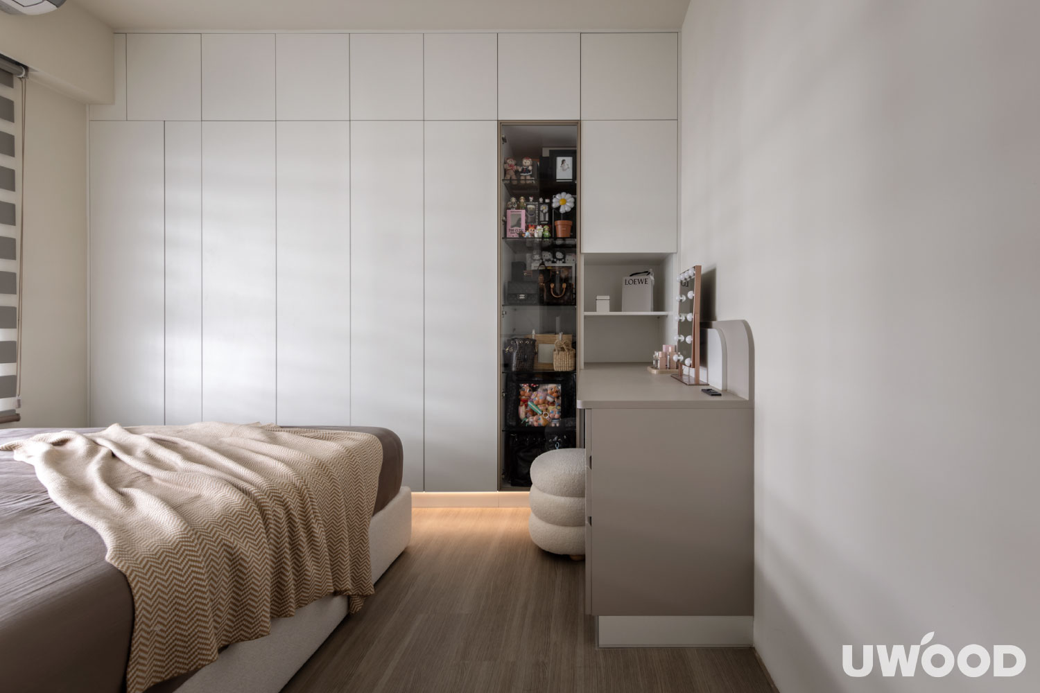 走入私領域,主臥延續公領域的平靜語彙。梳妝桌面與衣櫃立面流暢相連,維持乾淨俐落的視覺感受,並在其中穿插局部玻璃展示櫃,讓厚實櫃體多了一份呼吸節奏。.jpg)