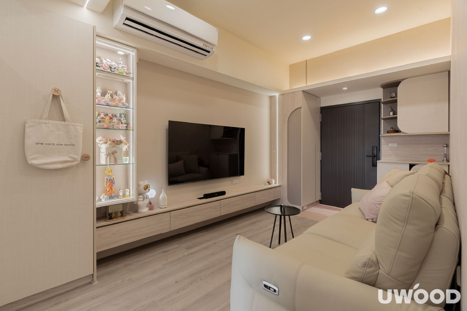 電視牆設計利用系統櫃的組合,將玄關櫃與電視櫃整併一體,高度與上方梁柱切齊,維持視覺和諧的同時,也不影響動線。