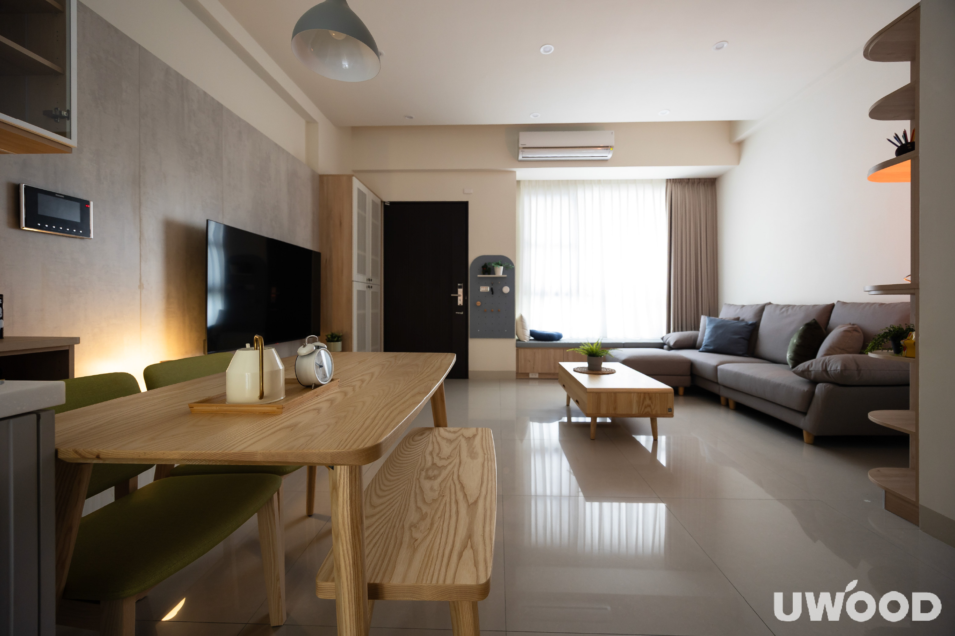 【客廳】鞋櫃以格柵門片設計,兼具透氣與美觀,並搭配洞洞板提供便捷物品取用。電視櫃運用系統板材和木紋設計,簡約大氣並兼具收納功能。臥榻區設置於大窗旁,軟墊增添舒適度並保護孩童安全。沙發旁的開放式收納櫃具展示功能,方便拿取日常物品。【廚房】用餐區透過牆面分區,底部設置層板,中段設洞洞板,用於掛取餐具和裝飾物。中島結合大理石檯面與插座開孔,提供實用性與設計感。電器櫃配有抽拉盤和大平台,並以圓弧設計的門片增添趣味感。【主臥】衣櫃和斗櫃巧妙搭配,提供收納空間並保持整潔。床背板以大膽的跳色設計與燈條增添層次感,床側設計有收納櫃與疊櫃,完美融合美觀與功能性。【遊戲室】木地板搭配亮麗色彩,創造充滿活力的遊戲空間。多功能收納櫃與造型門片促進整潔與創意發揮,成為孩子的遊樂天堂。