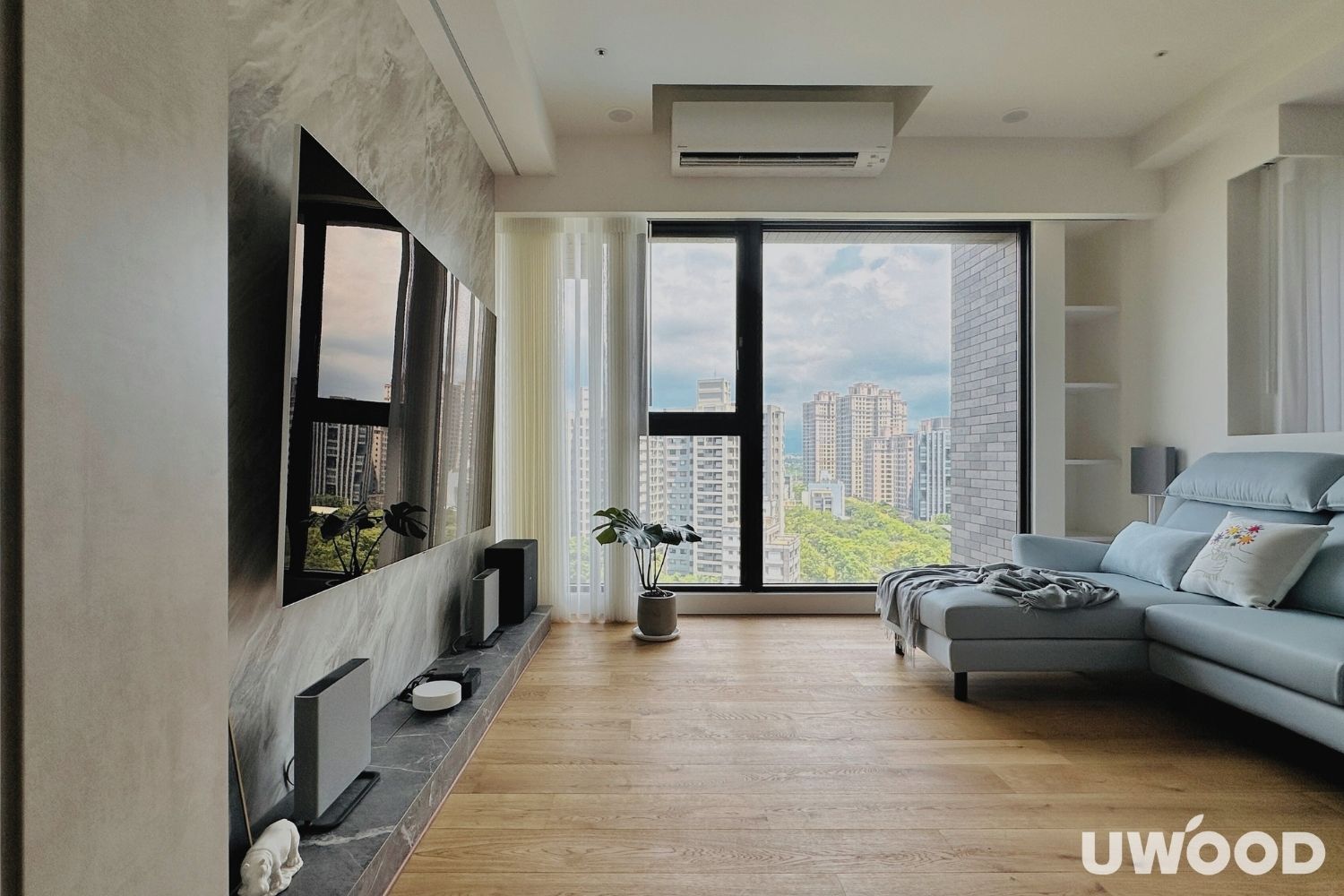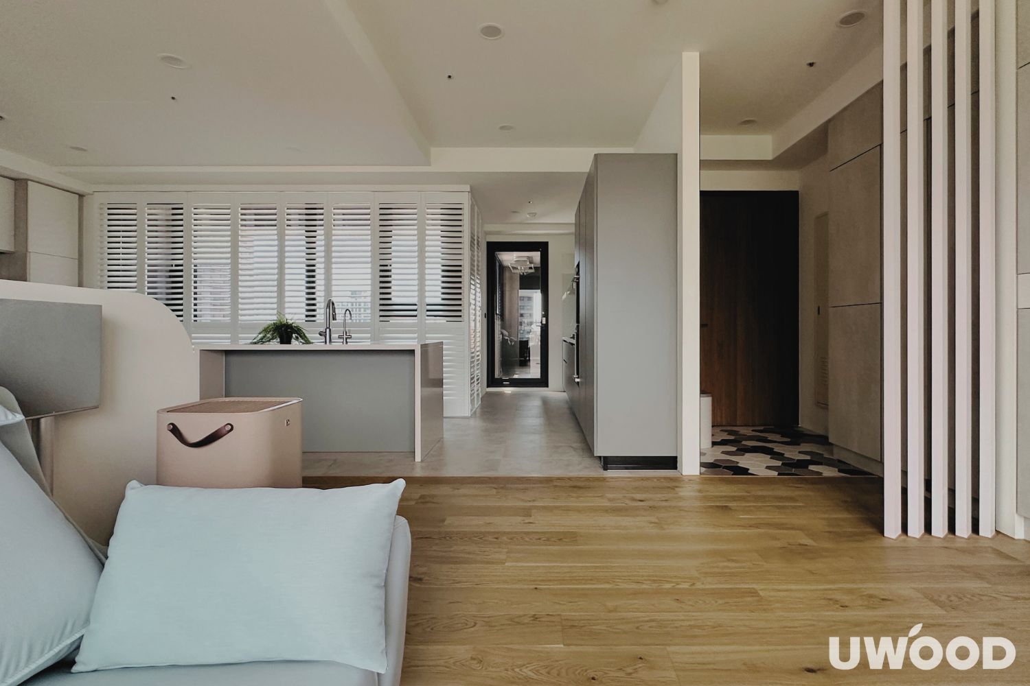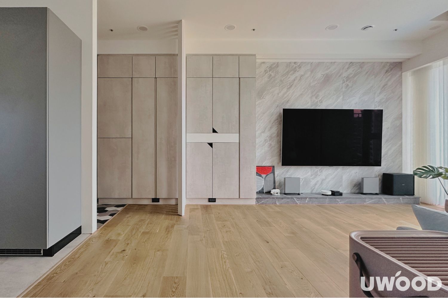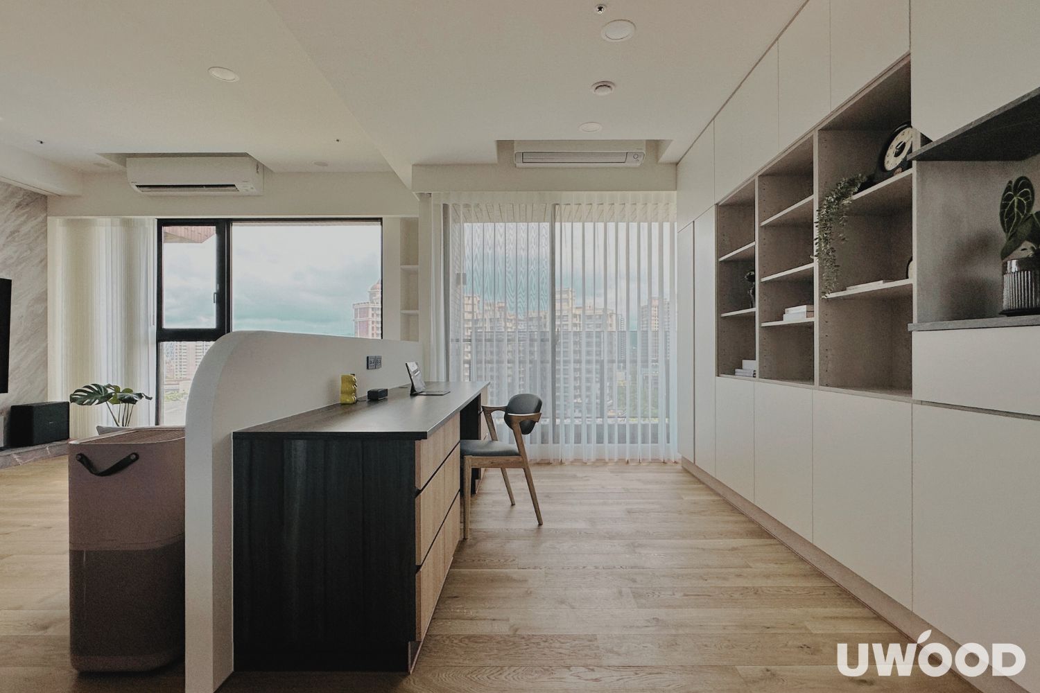 設計理念【客廳】設計過程中屋主希望以黑白灰色系的主色,因此利用淺灰色大理石紋系統板,搭配下方深色石紋平台,打造大氣質感的電視主牆。一旁以清水模灰斜切無把手收納櫃規劃,讓客廳營造出沉穩內斂的安定氛圍。【書房】利用半高沙發牆做為客廳與書房分界,圓弧造型的矮牆除了減少了銳利感,也為日後出生的幼兒增加安全考量。大尺度書桌後方的整牆書櫃,方便屋主收納書籍,也是珍藏品的展示空間,下方門片設計也為家中雜物增添了儲物功能。【餐廳】屋主期望在整體的冷色調中能夠帶有溫馨感,因此在開放式餐廚區中,以優渥的恬靜餐桌與細扶手餐椅規劃,溫潤自然的淺色實木餐桌椅,為空間營造了一絲人文溫度。【主臥】睡眠區以簡潔的6吋特羅斯床架及舒適的安琪拉床墊為屋主提供靜謐的舒眠空間。更衣區使用L型轉角衣櫃及大梳妝台打造充足的衣物收納空間。【次臥】做為日後增加家庭成員的靈活性空間,除了收納量充足的衣櫃外,睡眠區選用圓潤、床腳內縮的實木倚靠床架及克洛伊床墊搭配,打造溫柔舒適的臥室空間。