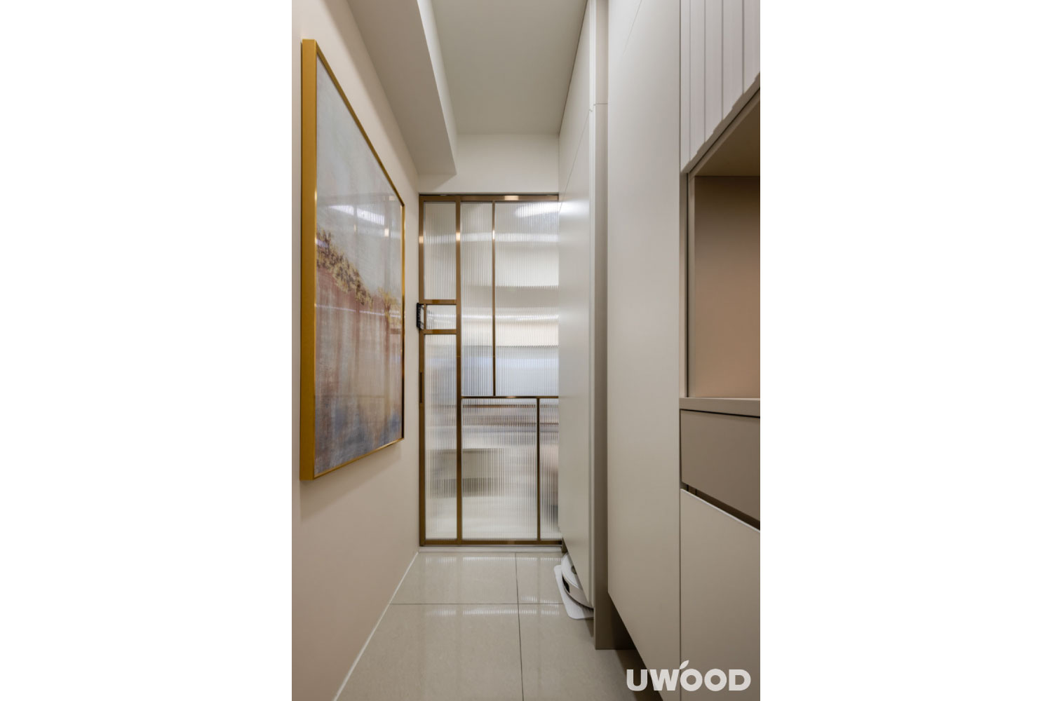 【玄關】設計師巧妙運用玄關區域,將鞋櫃、污衣櫃、日常備品收納,甚至掃地機器人的家,都集中整合在玄關裡,成為全家的收納中樞。內外空間設有一道鐵件拉門結合長虹玻璃,化解穿堂煞的風水疑慮,輕輕推門,彷彿也卸下了整日的疲憊。地坪則保留建商原有的磁磚材質,便於落塵與清潔;步入室內後,溫潤的Orderfloor超耐磨木地板,從腳下開始鋪陳回家的溫度與安心感。