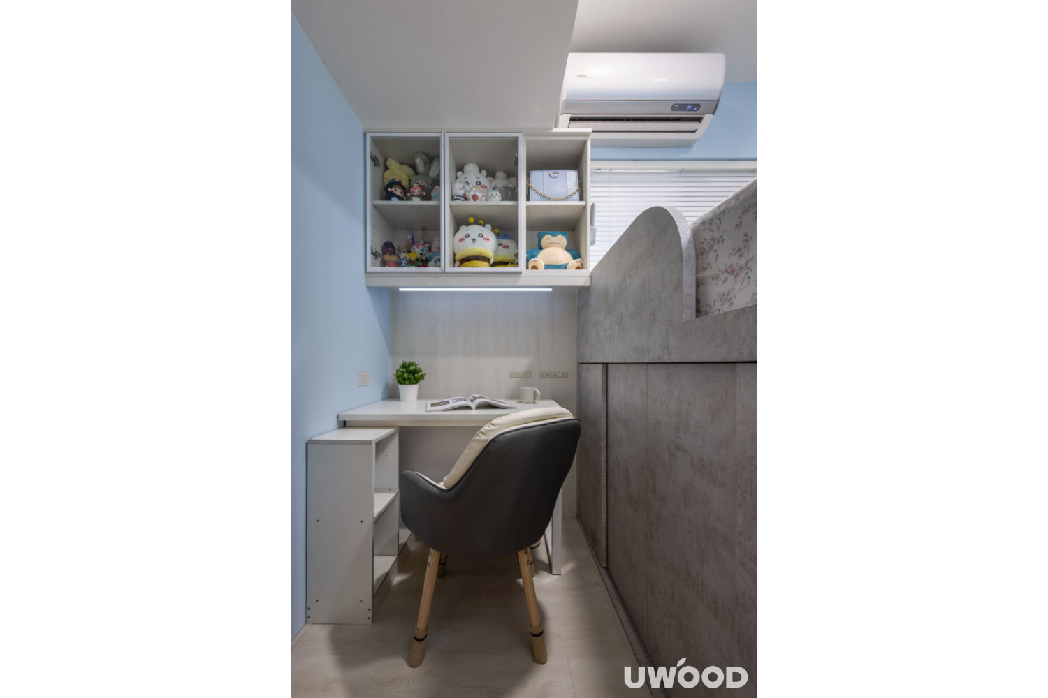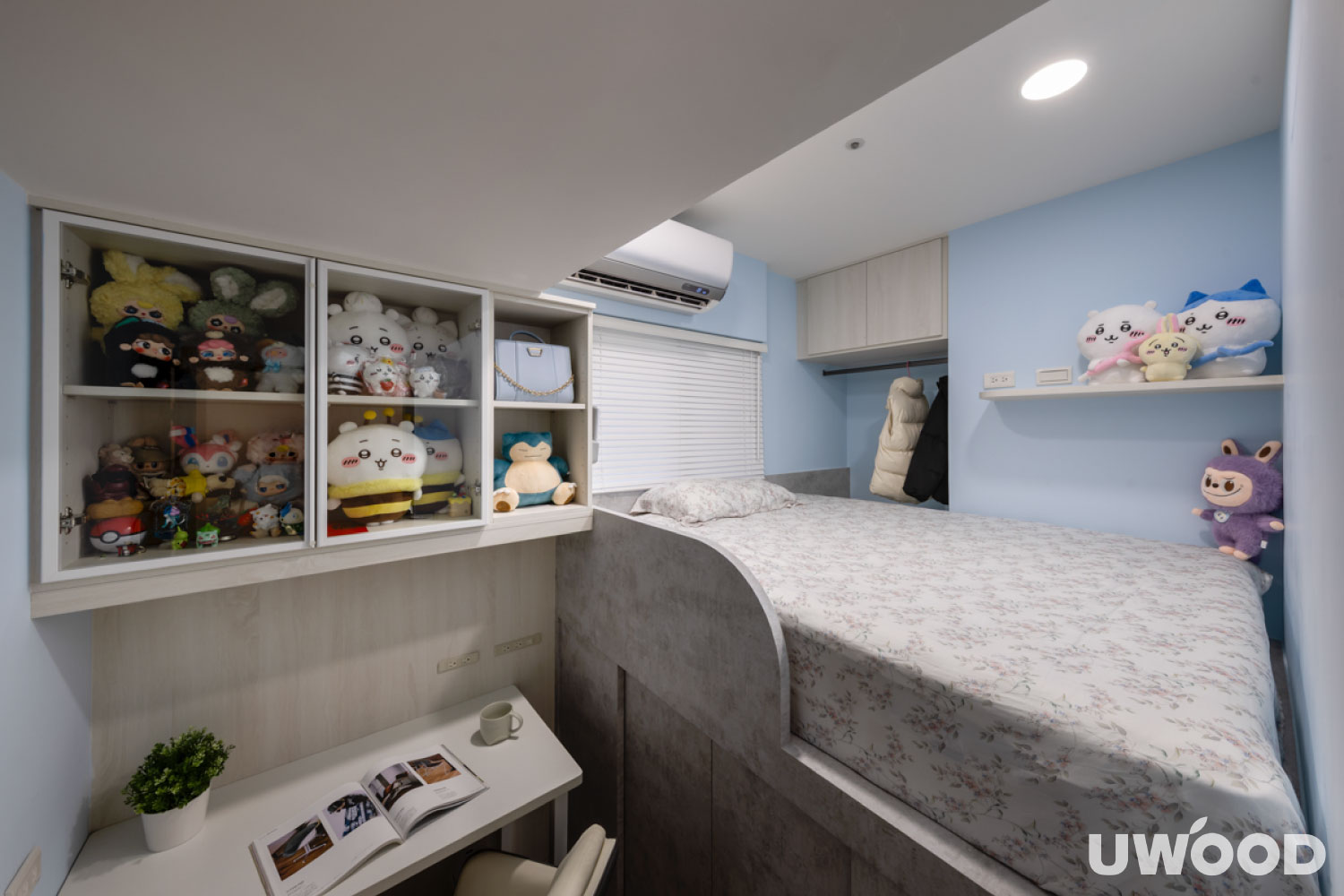 【次臥】有限的坪數空間內,又受到大梁限制,巧妙善用屋高與垂直空間,打造出木作架高床組,床鋪設於上方,成為舒適的休憩角落;下方則結合衣櫃與收納櫃,寬敞的空間足以放置行李箱。