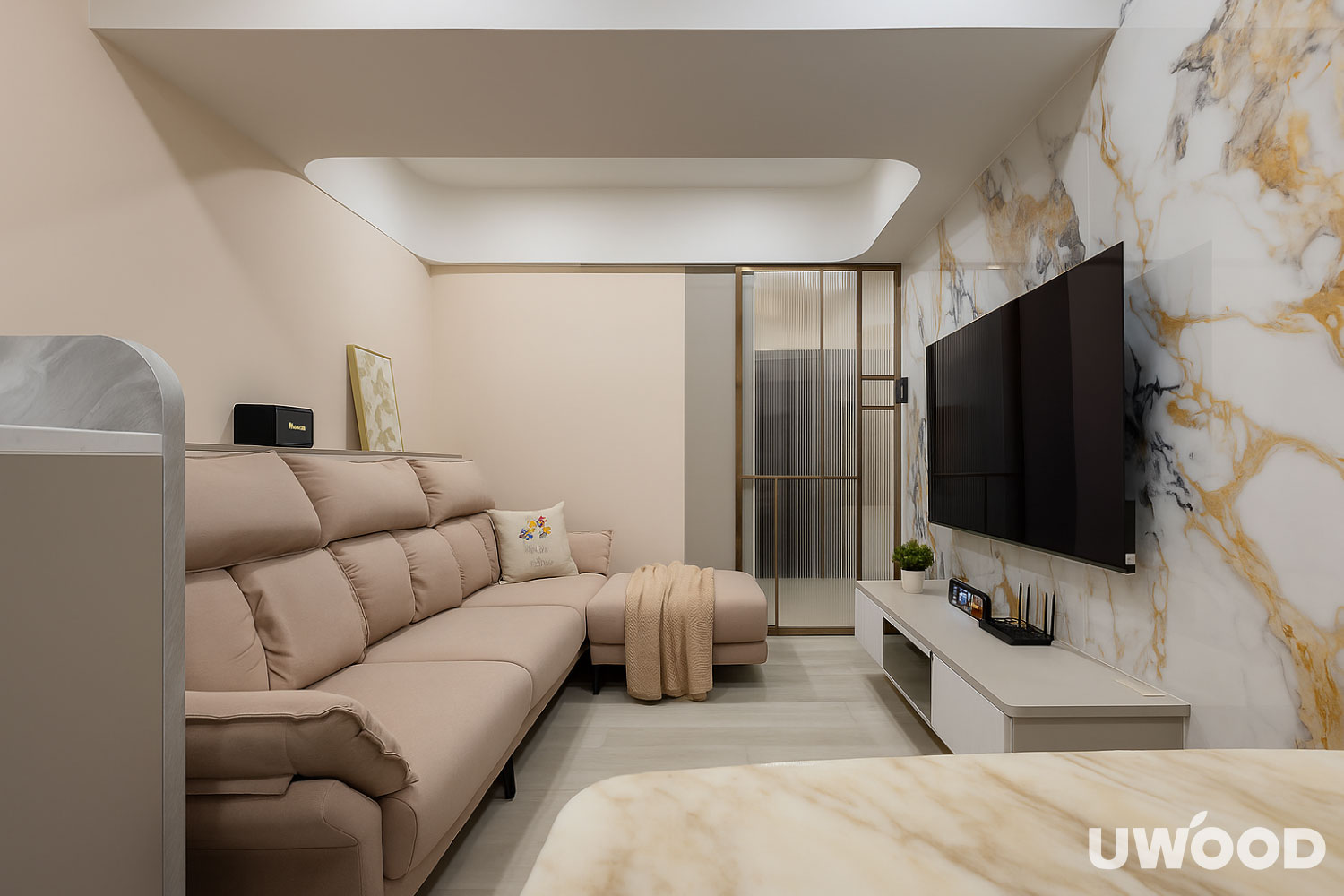 【客廳】電視牆採用帶有金色紋理的石紋美耐板,在燈光映照下閃耀光澤,綻放出屬於女主人的高雅氣場與自信。天花因結構大梁貫穿,特別以圓弧設計修飾線條,柔化壓迫感。沙發後方特別規劃半高牆,既可作為靠背,也設置了帶有四個插座的小平台,讓每個人都能同時充電。