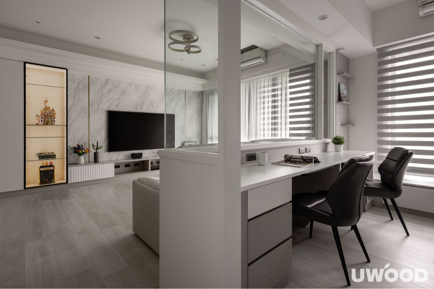 【餐廳】餐邊櫃中段牆面鋪上石紋貼皮,大理石紋檯面隨光線折射出細緻紋理,讓用餐區在簡約基調中多了一絲輕奢感。整體色系與公共區域相互呼應,使就餐氛圍更顯柔和與自在。