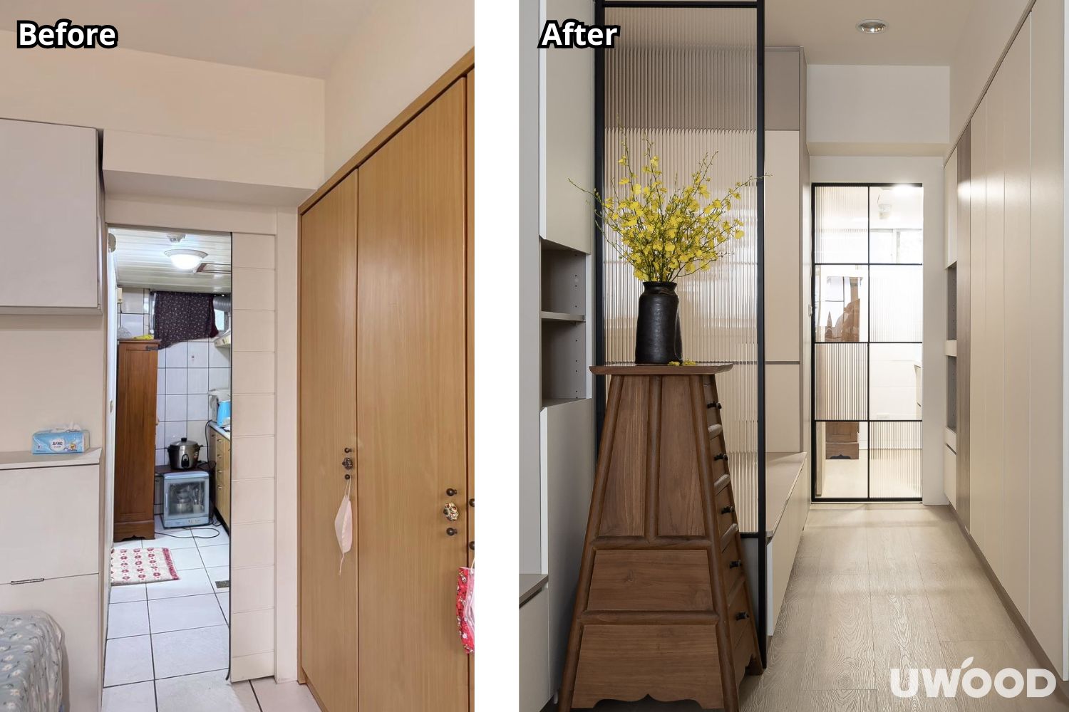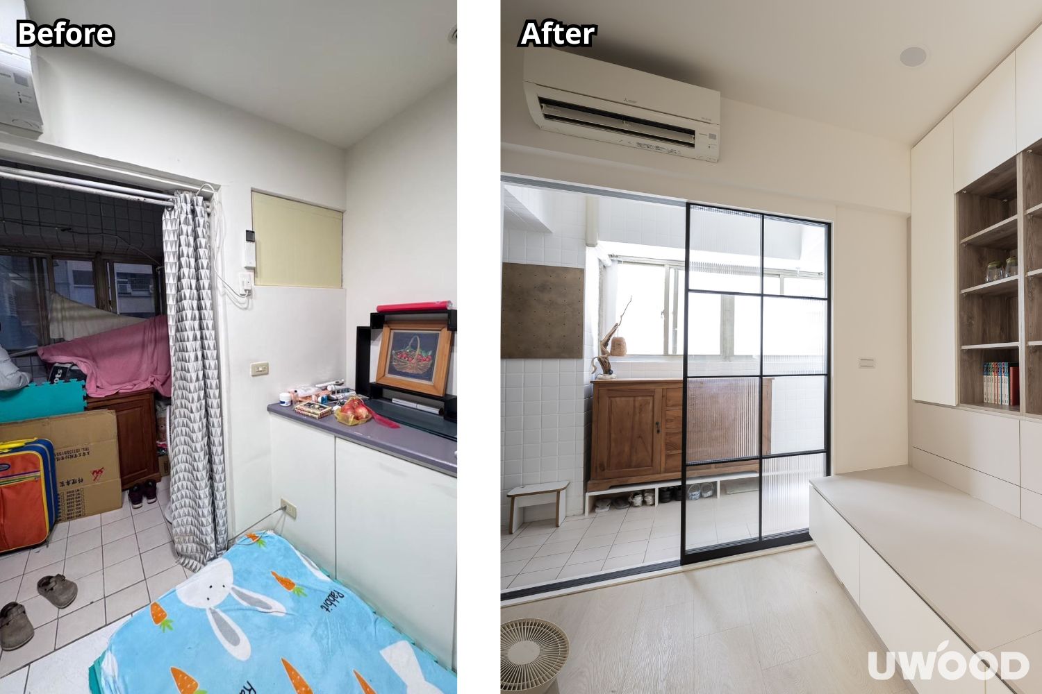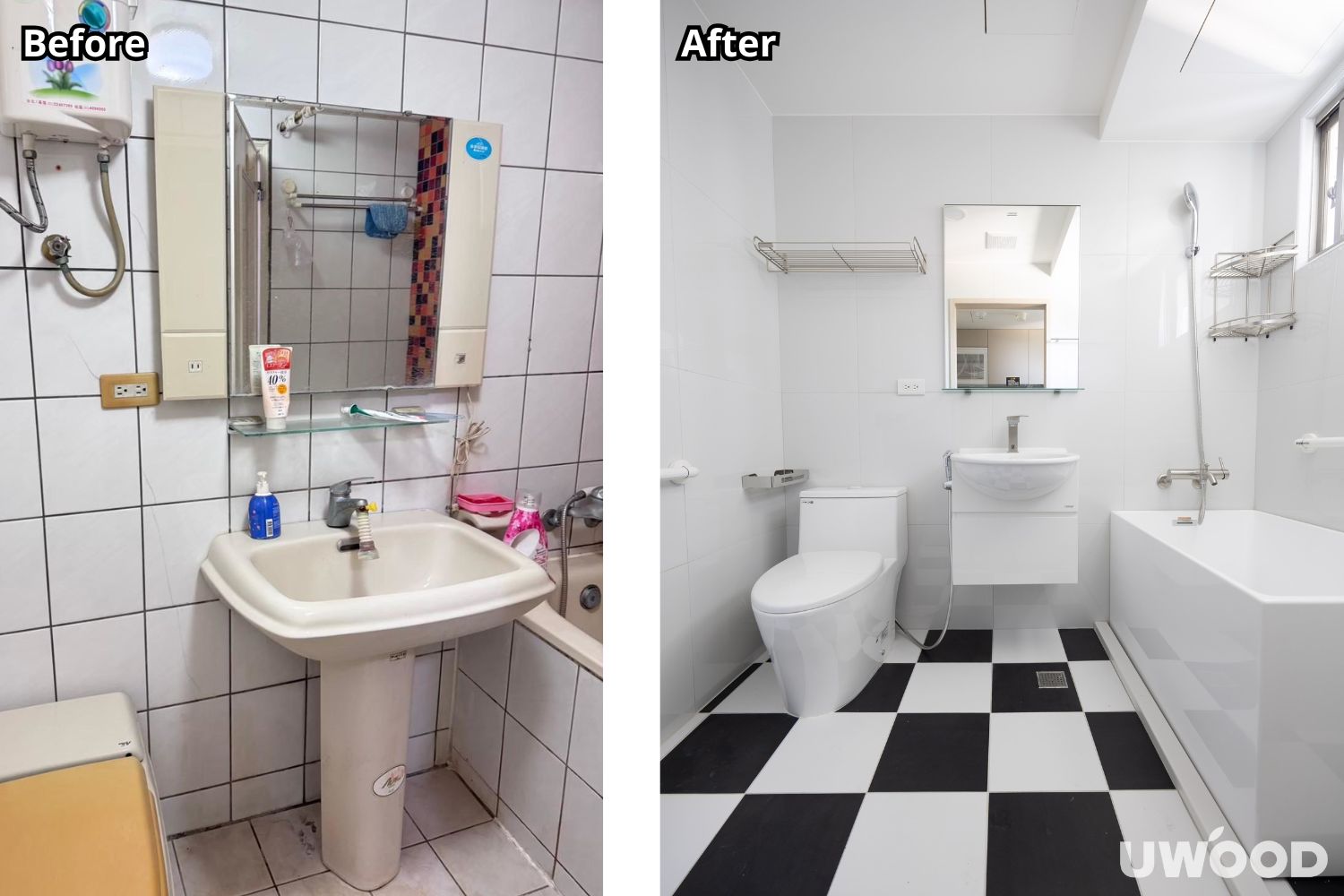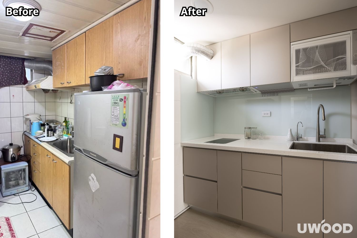 【臥榻】休憩區臥榻下方是數個上掀式深度收納櫃,換季寢具、行李箱等大型雜物皆能藏於無形。牆面除了有充足的收納櫃外,轉角處的櫃體內也配置吊衣桿,方便屋主吊掛衣物,維持空間的乾淨清爽。【衛浴】採用經典黑白格紋地磚,搭配純淨的白色磁磚與完備的浴缸配置,營造摩登時尚的衛浴空間。【廚房】「麻雀雖小,五臟俱全。」廚房區域重新規劃後,以柔和的奶茶色櫥櫃加上烤玻,將家電、廚房設備高效整合,讓屋主炒菜做飯也能自在享受溫馨愜意的氛圍。