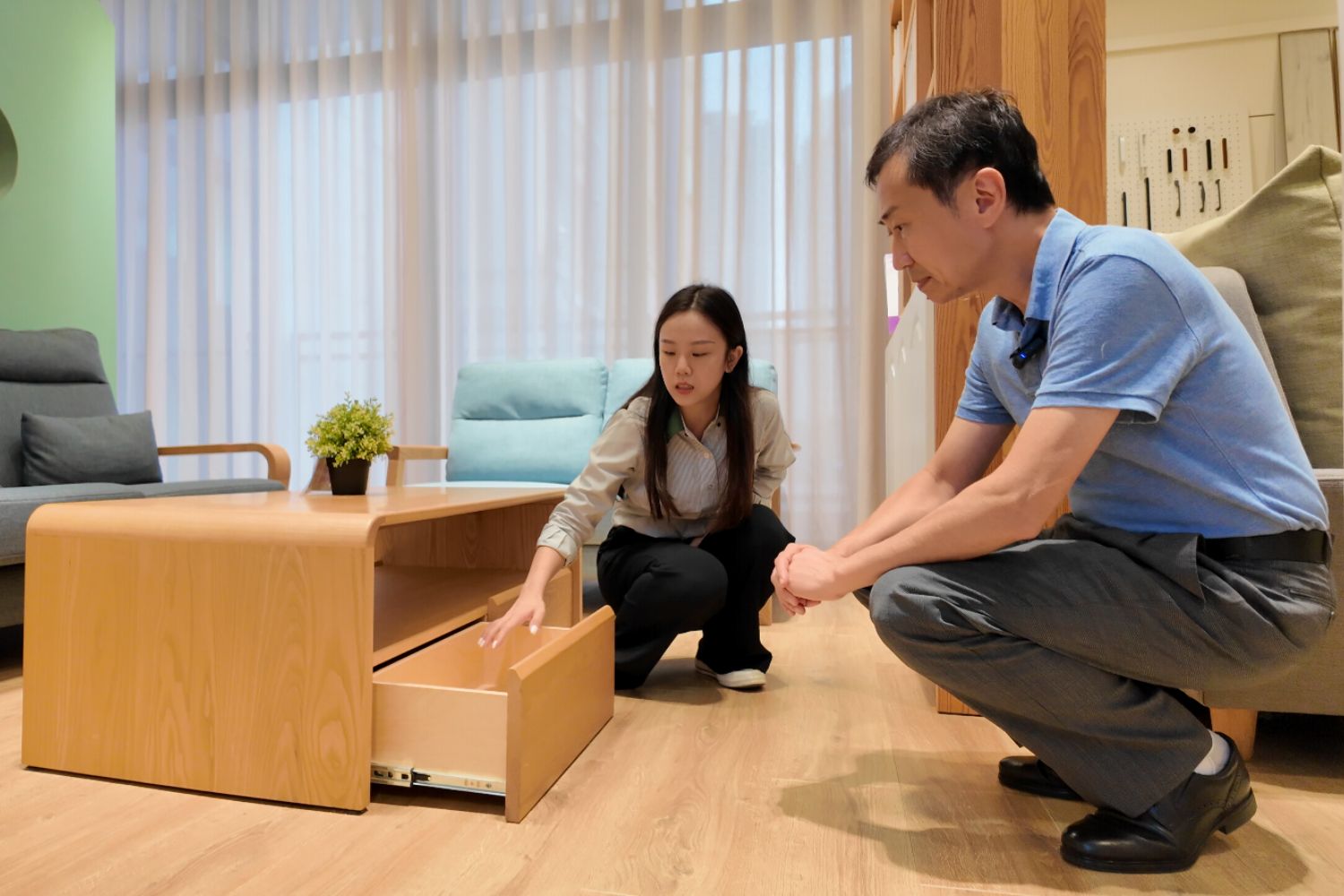 「優渥採用低甲醛綠建材系統櫃及具緩衝功能的五金,讓家人使用安心。小空間特別設置165度腳鏈,門片開啟角度加大,讓收納更便利。」